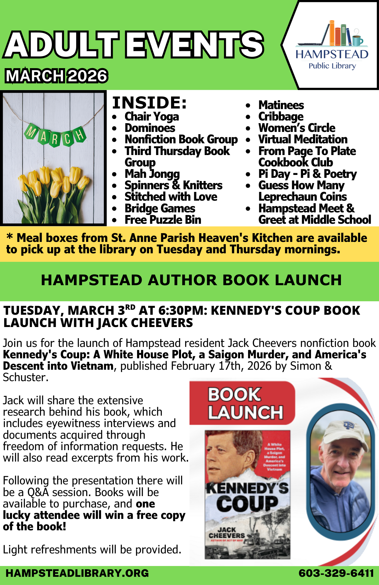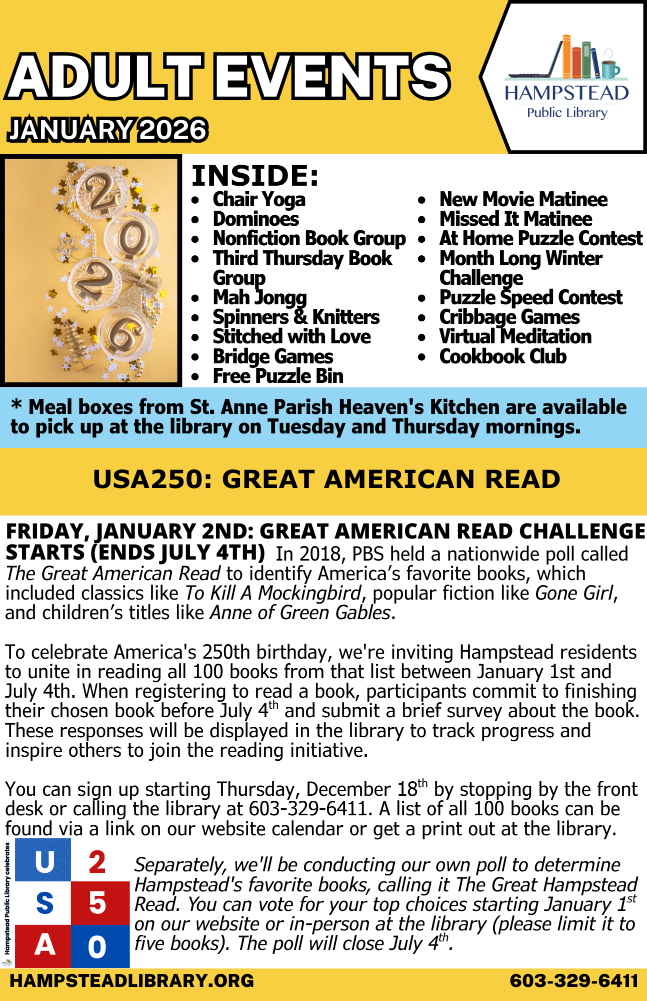 Additionally, we're conducting a poll to determine Hampstead's favorite books, calling it The Great Hampstead Read, to complement our Great American Read challenge. You can vote for your top choices (please limit it to five books) via this link or in-person in the library by Saturday, July 4th, and we'll share the results after!